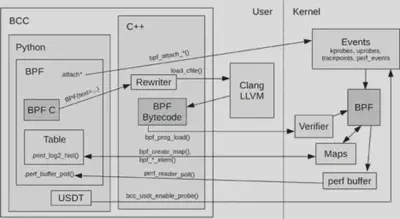 - 内核中的 BPF 字节码负责在内核中执行特定事件,如需要也会将执行的结果通过 maps 或者 perf-event 事件发送至用户空间;