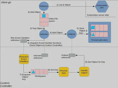 ⚠️ 这张图分为两部分,黄色图标是开发者需要自行开发的部分,而其它的部分是 client-go 已经提供的,直接使用即可。