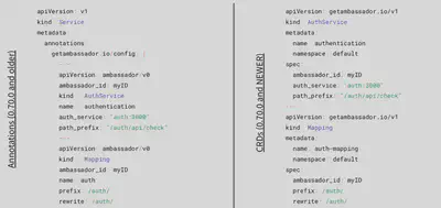 Ambassador 不同版本之间配置方式的变更如下图所示,configmap 方式是早期使用方式,目前已经被废弃了,现在更推荐使用 CRD 方式。