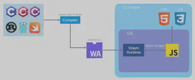 浏览器引擎集成了一个 Wasm 虚拟机,通常称为 Wasm 运行时,它可以运行 Wasm 二进制指令。有编译器工具链(如 Emscripten)可以将源代码编译为 Wasm 目标。这允许将传统应用程序移植到浏览器,并直接与在客户端 Web 应用程序中运行的 JS 代码通信。