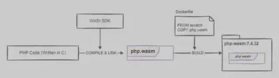 构建过程使用 WASI-SDK 工具集。它包括一个可以构建为 wasm32-wasi 目标的 clang 编译器,以及实现在 WASI 上的基本 POSIX 系统调用接口的 wasi-libc。使用 WASI SDK,我们可以从 PHP 的 C 代码库构建 Wasm 模块。然后,我们只需要一个基于 scratch 的非常简单的 Dockerfile 就可以制作一个 OCI 镜像,该镜像可以使用 Docker+Wasm 运行。