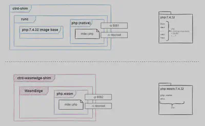 首先,探索镜像时,我们会发现 Wasm 容器镜像比传统容器镜像小得多。即使是“php”容器的alpine版本也比 Wasm 容器大。