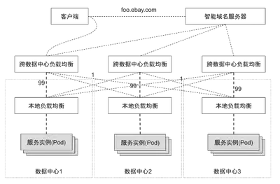 - 针对核心应用,除集群本地负载均衡配置以外,还需配置跨数据中心负载均衡,并通过权重控制将 99% 的请求转入本地数据中心,将 1% 的流量转向跨地域的数据中心。该配置的主要目的是当某应用的所有本地服务实例失效时,运维可快速将跨数据中心负载均衡器上指向本地的 99% 流量的成员禁止掉,流量可在秒级转向其他数据中心从而保护业务不受影响。业务版本发布、硬件故障、防火墙、路由器等网络设备变更都有可能导致本地服务实例失效。