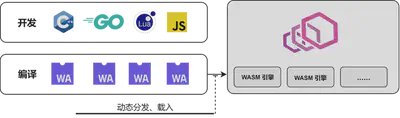 说回到 WASM。WASM 本身是源自前端的技术,是为了解决日益复杂的前端 Web 应用以及有限的 JS 脚本解释性能而诞生的技术(有别于 JIT 的另一条路线)。WASM 并不是一种语言,而是字节码标准。理论上任何一种语言,都可以被编译成 WASM 字节码,然后在 WASM 虚拟机中执行。其原理如下图所示:
