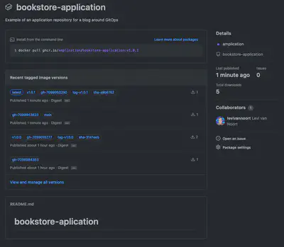 如果我们现在发布主分支中的所有内容,版本号为 v1.0.0,我们可以看到应用程序镜像的新版本,其中 sha-<number> 也放在新镜像上,因为在上次推送到 main 分支和标记之间没有进行新的提交。
