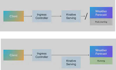 现在,通过 Knative 的视角,让我们考虑下面的示例:有如下一个场景,客户端希望从一个在 Knative 平台上注册但不一定立即运行的应用程序中检索天气预报信息。使用 Knative 术语,有一个服务可以创建必要的配置和路由,以便在调用天气预报应用程序时运行它。在 Knative 上下文中,应用程序包括: