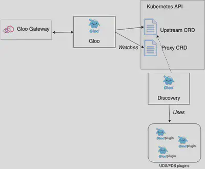 Gloo 控制平面中的discovery组件仅使用其 UDS 和 FDS 服务来发现Upstream对象并将其写入 Kuberentes CRDs。从这里,用户可以创建从 Envoy 代理上的特定 API 路径到Upstream上的特定函数的路由规则。Envoy 代理不直接与这个控制平面组件交互 (请回忆一下,Envoy 只使用gloo组件公开的 xDS API)。相反,discovery组件促进了向Upstream的创建,然后可以由Proxy对象使用。这是一个使用支持微服务 (本例中的discovery服务) 来为控制平面的整体功能做出贡献的好例子。