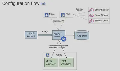 早期的 Galley 仅仅负责对「配置」进行运行时验证,istio 控制面各个组件各自去list/watch 各自关注的「配置」, 以下是 istio 早期的 Configuration flow: