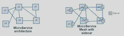 带有和不带 sidecar 的微服务架构。使用 sidecar=服务网格