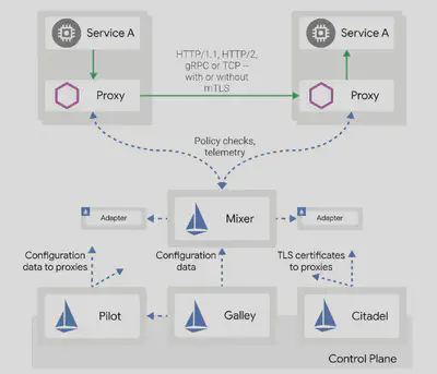 Istio 由数个管理组件的控制平面和控制平面控制的与 Envoy sidecar 一起运行的服务集合构成。控制平面由以下几个组件组成: