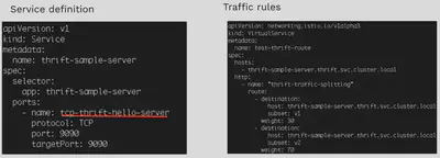 我们来看看如何采用 Aeraki 来实现上面 Thrift 服务的 Traffic Splitting 用例。首先我们需要在 Thrift Service 定义的 Port 命名中声明该 Service 的七层协议类型:“tcp-thrift-hello-server”,然后创建一个 VirtualService 将 Thrift 请求按照指定比例路由到不同的服务版本中。Aeraki 将根据服务定义和 VirtualService 生成所需的 Envoy 配置,并通过 EnvoyFilter 发送给 Istio。