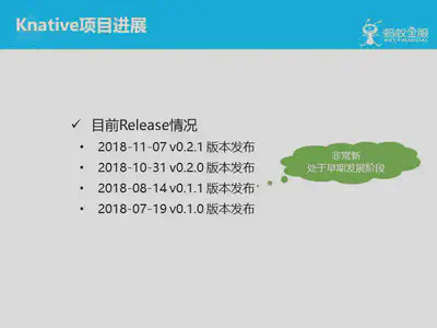 备注:这是截至 2018-11-24 演讲当天的情况,到 2018 年 12 月底,knative 已经发布了 v0.2.2 和 v0.2.3 两个 bugfix 版本。但也还只是 0.2 ……