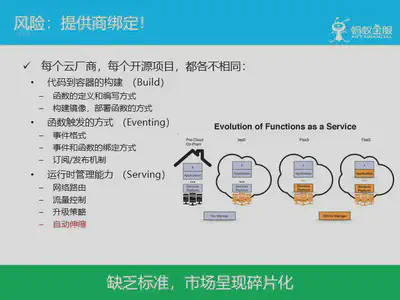 这就是目前 serverless 的问题:由于缺乏标准,市场呈现碎片化。不同厂商,不同项目,各不相同,因此无论怎么选择,都面临一个风险:供应商绑定!