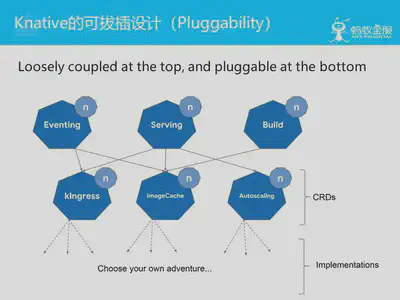最后聊聊 knative 的可拔插设计,这是 knative 在架构设计上的一个基本原则:顶层松耦合,底层可拔插。