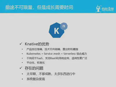 当然,knative 体系的复杂度问题是无法回避的:kubernetes,istio,knative 三者都是复杂度很高的产品,加在一起整体复杂度就非常可观了,挑战非常大。