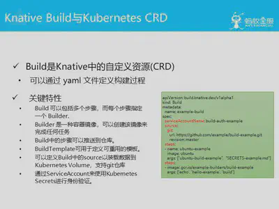 Knative Build 在实现时,是表现为 kubernetes 的 CRD,通过 yaml 文件来定义构建过程。这里引入了很多概念如:build,builder,step,template,source 等。另外支持用 service account 做身份验证。