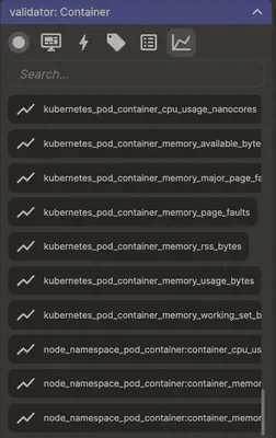 场景可以包括度量指标,允许用户学习 Pod、节点和命名空间之间的关系以及与它们相关的指标。如果所选实体有任何关联的指标,那么它们将出现在上下文菜单中的指标选项卡下。