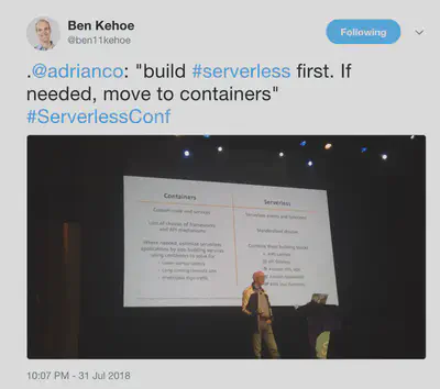 Serverless 的工具支持将会越来越好,但至少目前,仍然远远落后于容器。在容器领域工作的人面临的挑战是抵制修补和追求简单的冲动。