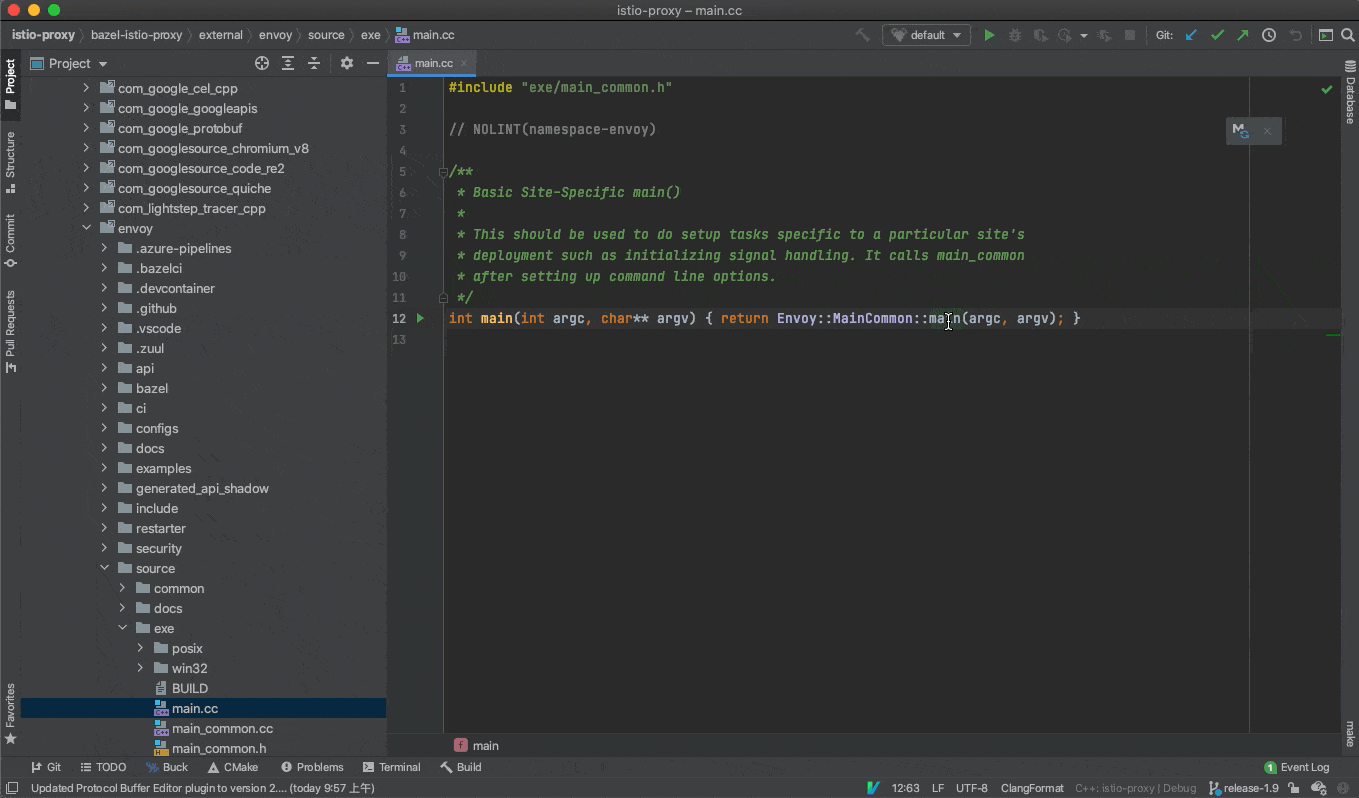 然后就会开始索引,完成后就可以愉快的看代码了,先从 main 看起吧 (bazel-istio-proxy/external/envoy/source/exe/main.cc):