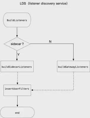 了解 EnvoyFilter 的基本使用之后,我们将深入分析 Pilot(1.1.2) 源码,来探究 EnvoyFilter 的工作原理和隔离性不足的根源。下图展示了构建 Envoy 监听器的主要工作流程。