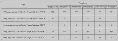 在我们的示例表中,我们有带有path和status标签的计数器http_requests_total。对于每个path和status的组合,我们为每个时间戳存储一个计数器值。