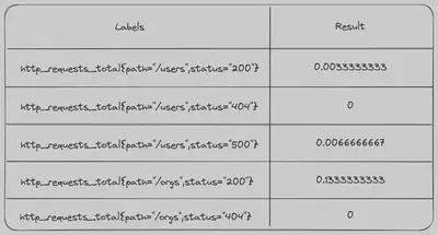 如果我们将以下查询发送到 Prometheus,我们将获得以下即时向量。请注意,它只是上面表格中的最后一列数据。