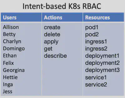 下面的基于意图的 K8s RBAC 图从概念上显示了你必须使用 RBAC 的工作内容 —— 你可以选择哪些用户 / 操作 / 资源组合是允许的。